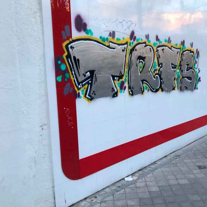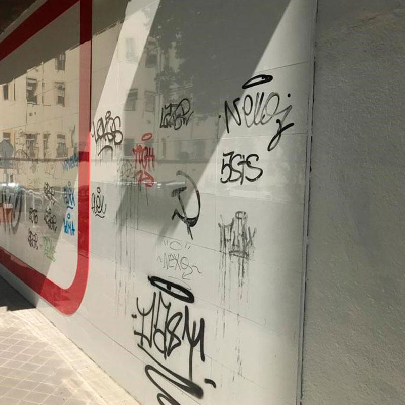 Ofrecemos también una solución en forma de protección tanto para fachada como para escaparates frente a los grafitis que dañan las superficies de los mismos.